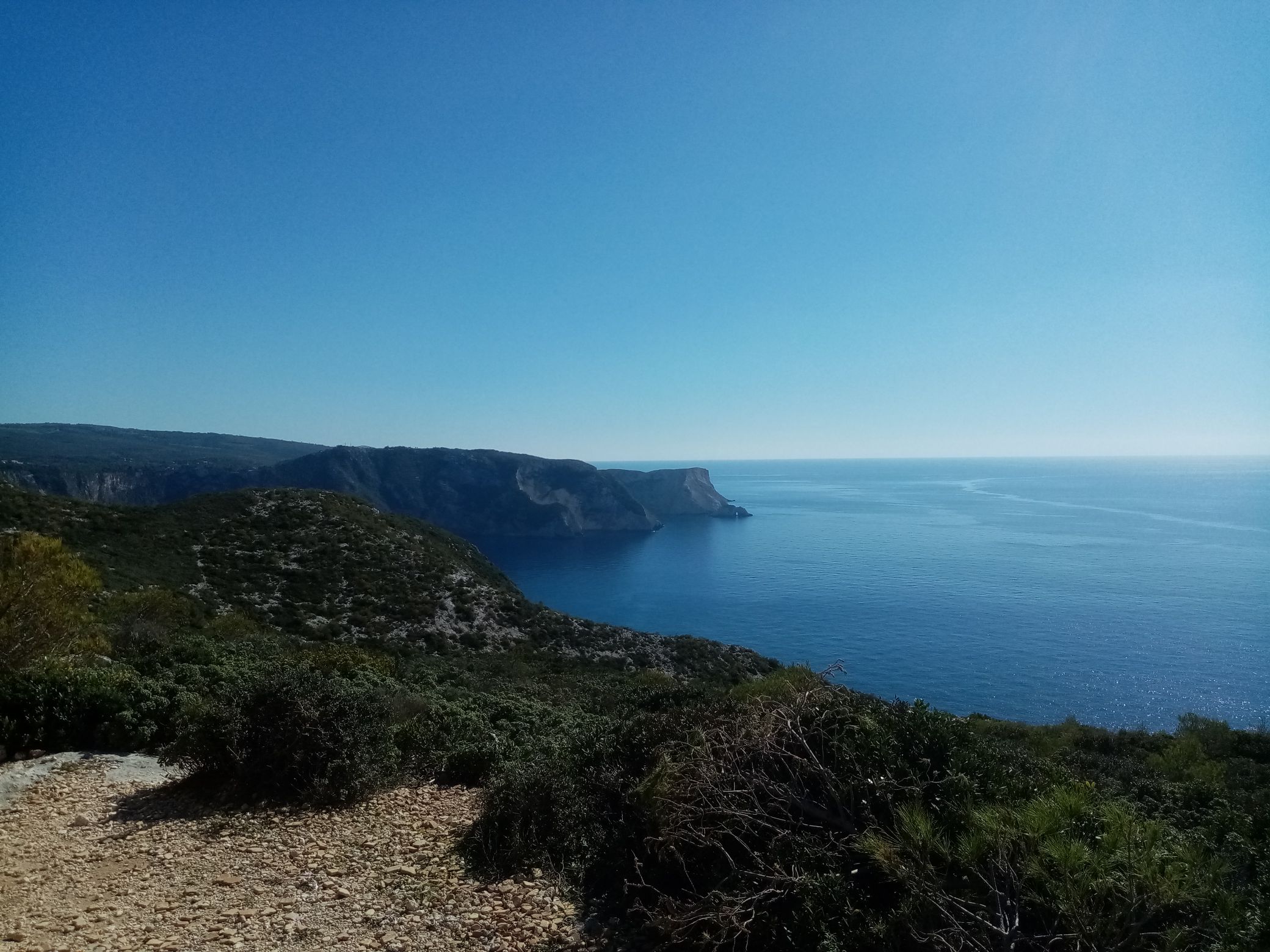 Het vlakke land en de bergrug er achter, helemaal rechts op de bergrug zien wij het kloosterpad liggen |